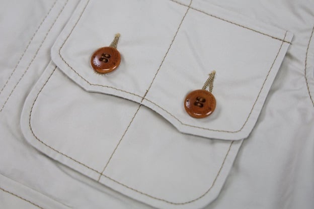 左胸、裾のポケットはマチ付き且つ、ボタン留めが上部にも設けられており、内容物の収納量で