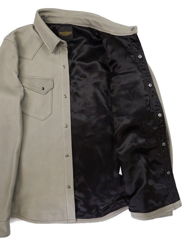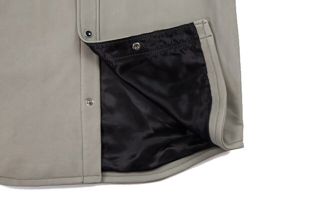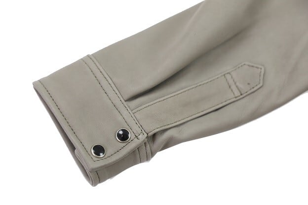 素材は上質で滑らかなシープスキンを使用。素あげ処理により革質も柔らかい質感そのままを感じられ着こむほどにグレーのトーンが変化し、表情も含めて経年変化して頂けます。裏地は袖裏も含めてキュプラを使用し、滑らかで袖通りも良く、抜群の着心地になっています。