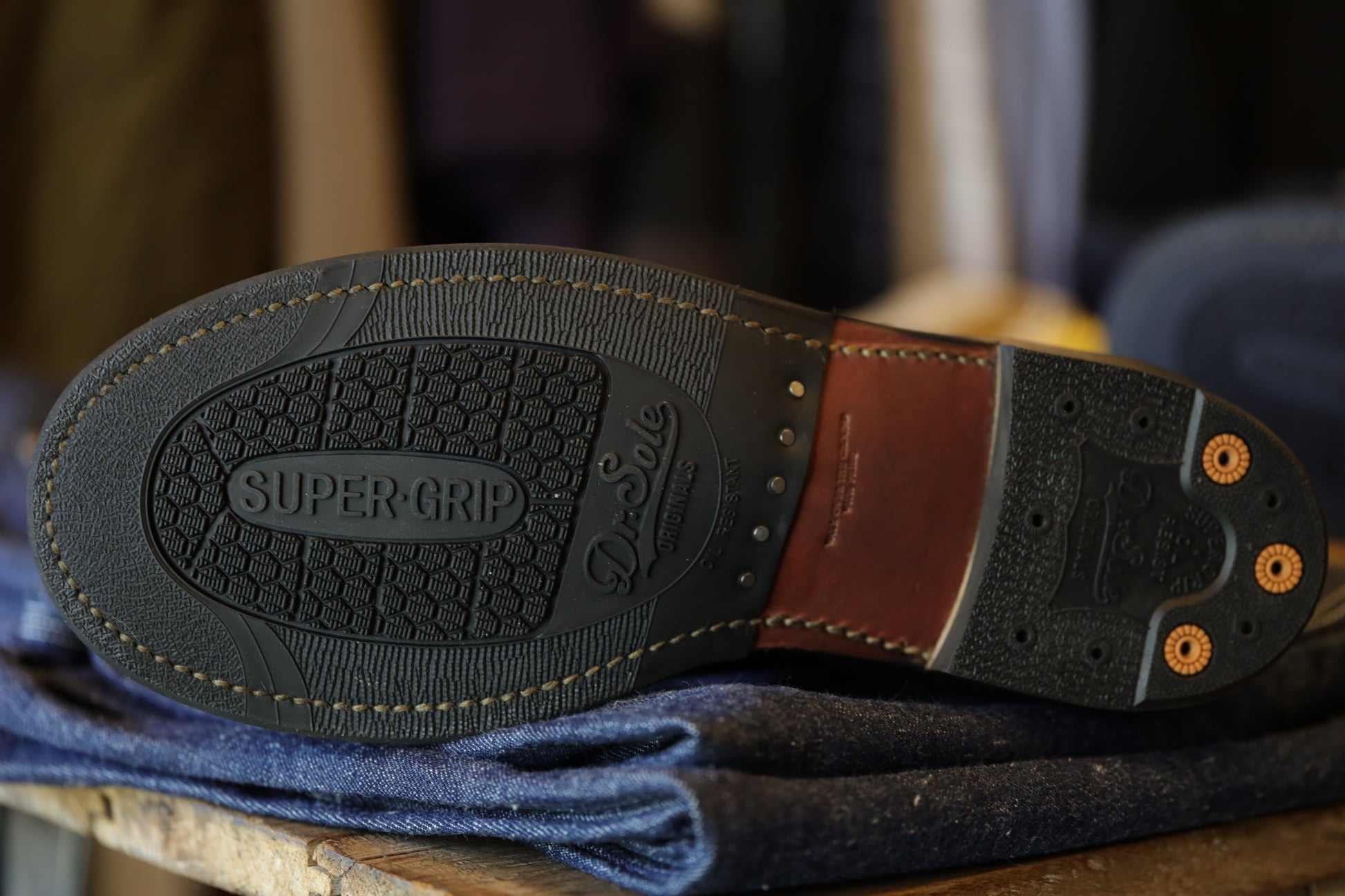 グッドイヤーウェルト製法、アウトソールにDr.SOLEを使用しており、耐久性があって滑りにくく本製品の雰囲気にもマッチしています。