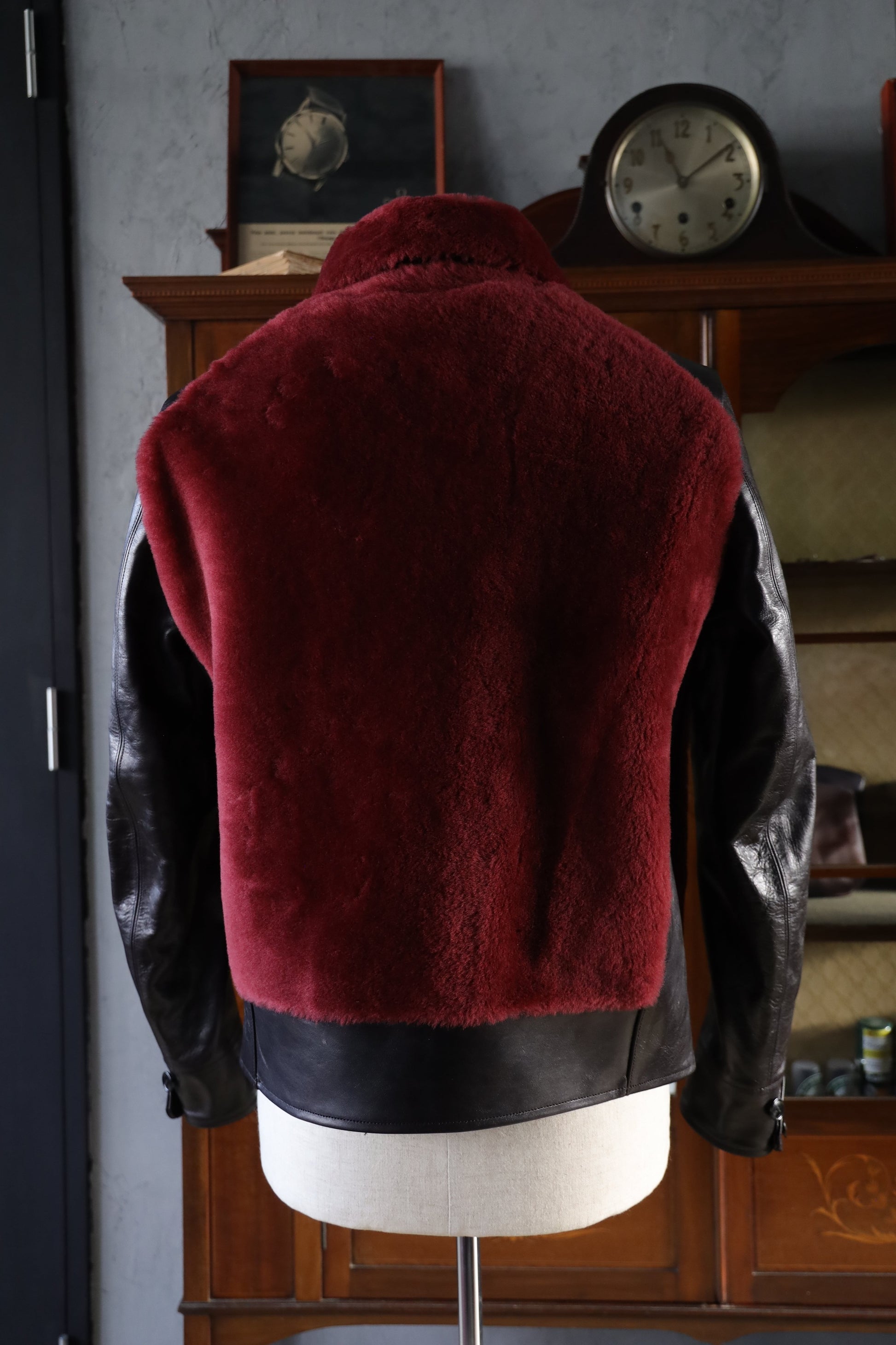 本製品は素材にホースハイドレザーを使用し、シープムートンにはレッドをあしらった、非常に無骨でワイルドな印象のグリズリージャケットとなっています。