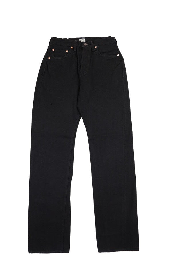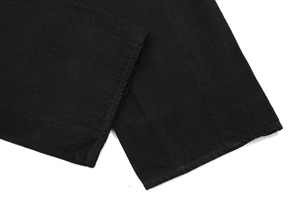 スタイルは5POCKETのブラックジーンズ。フリーホイーラーズにてオリジナルで製作されたデニムはタテ糸に硫化染色のロープ染め、ヨコ糸にチーズ染色のブラックを使用しており、シャトル織機にてローテンションで織りあげられたシュリンクデニムを使用。