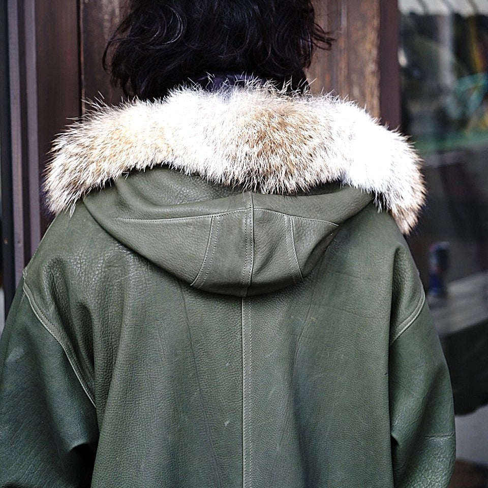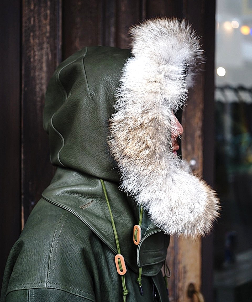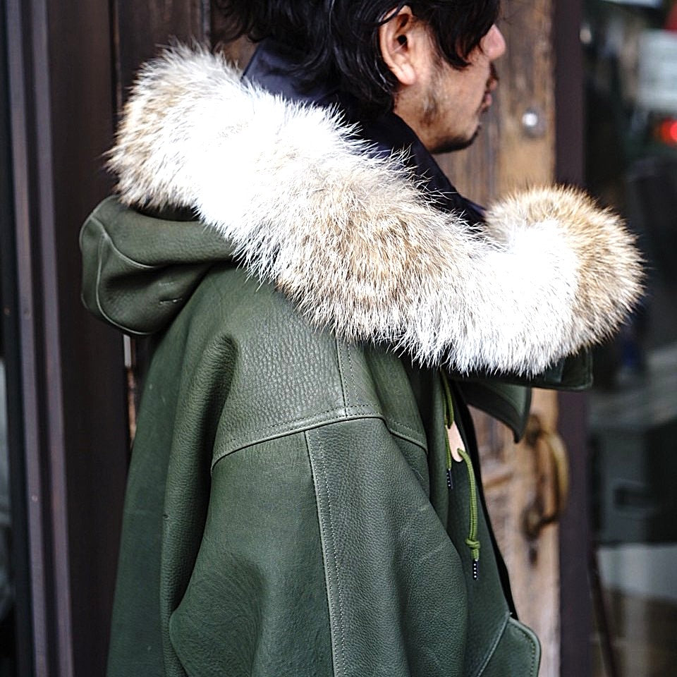 それによって各所革の部位の取り方、立体に成形した時点での修正点、ジャケットにつけてみた時の見え方など、何度もサンプルを作り直し、完成したスペシャルなレザーフードとなっています。