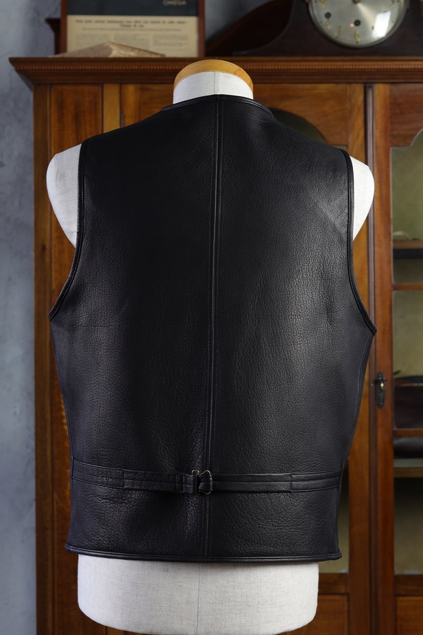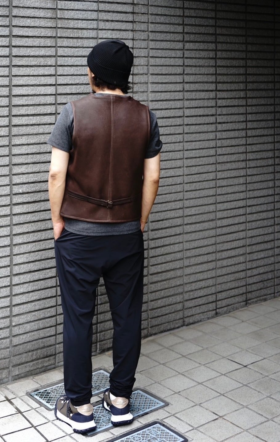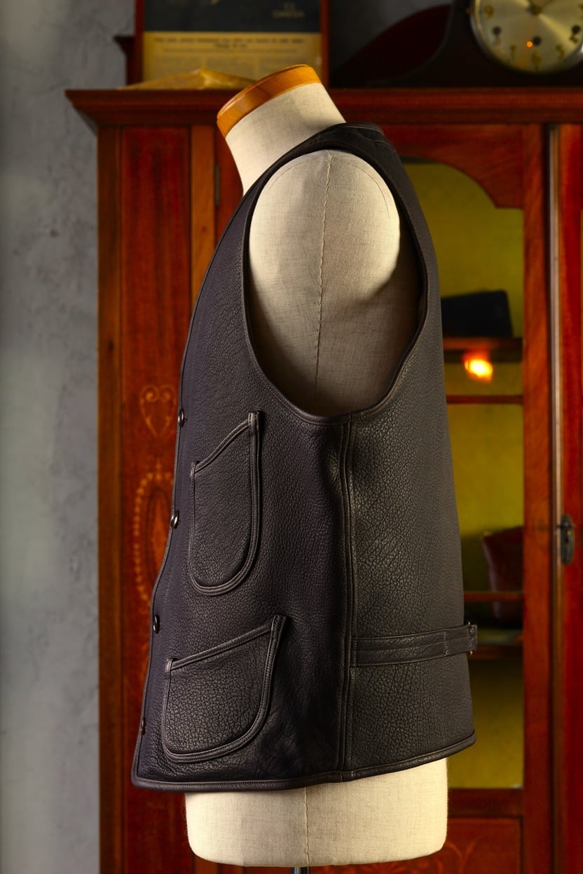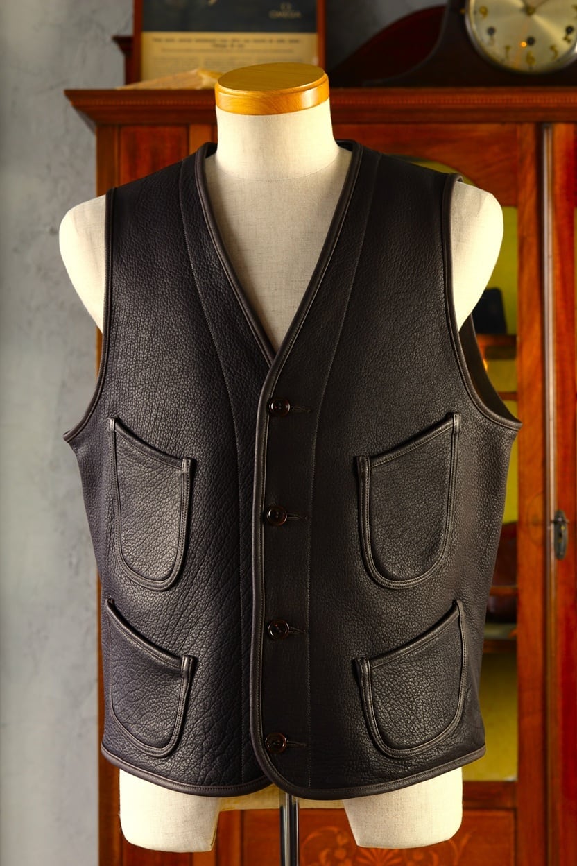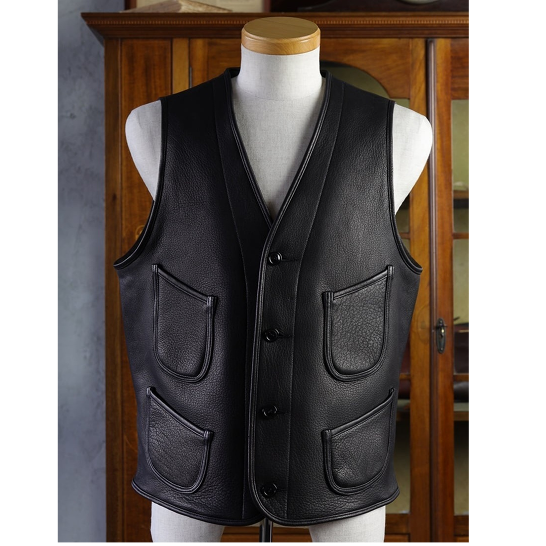 素材にディアスキンレザーを使用した、4ポケットのレザーベスト。