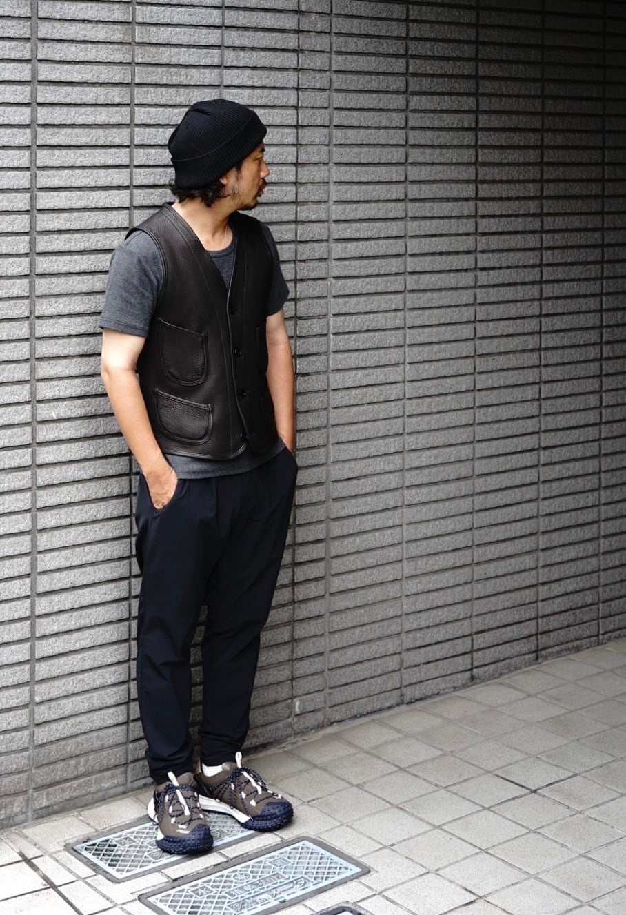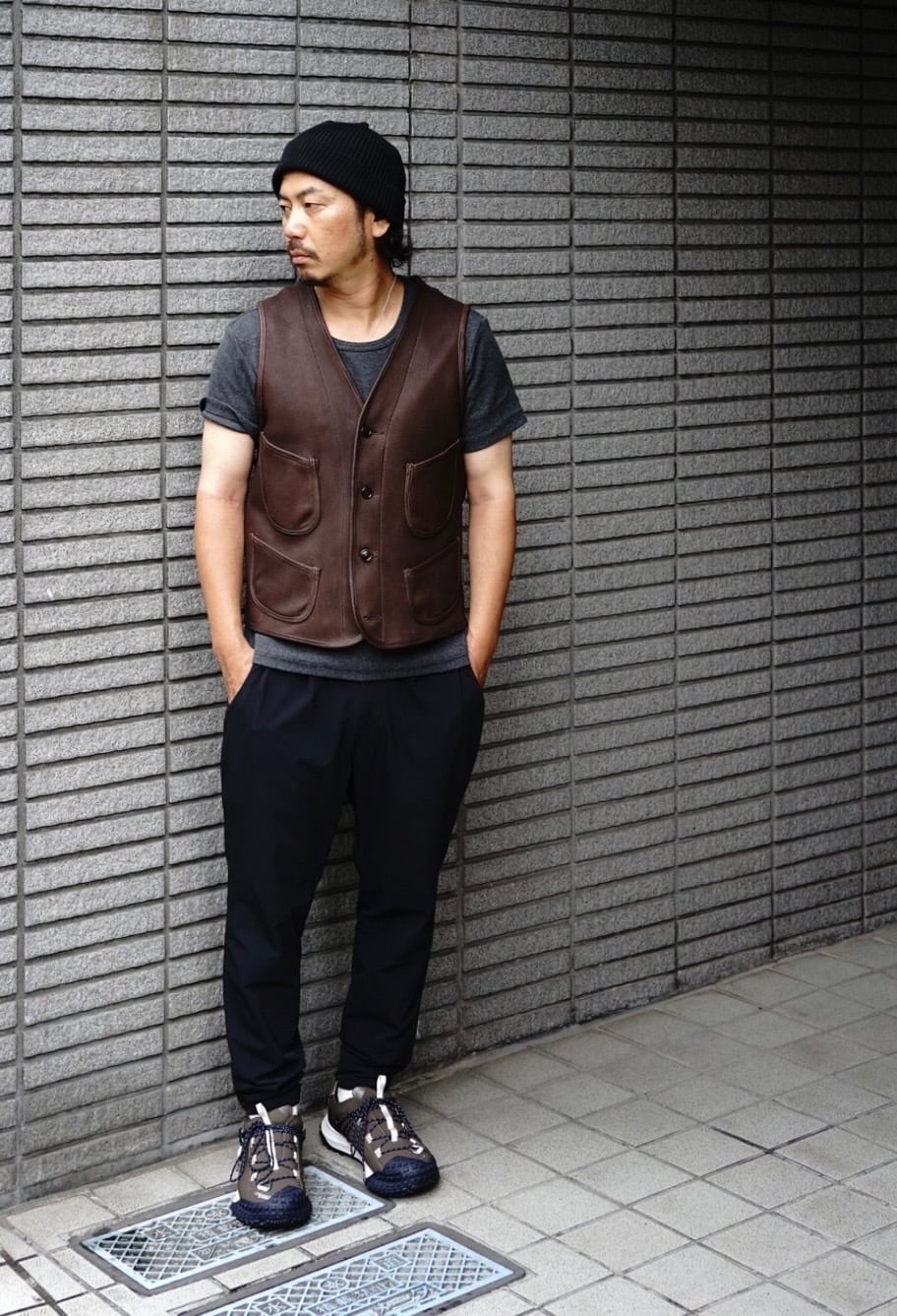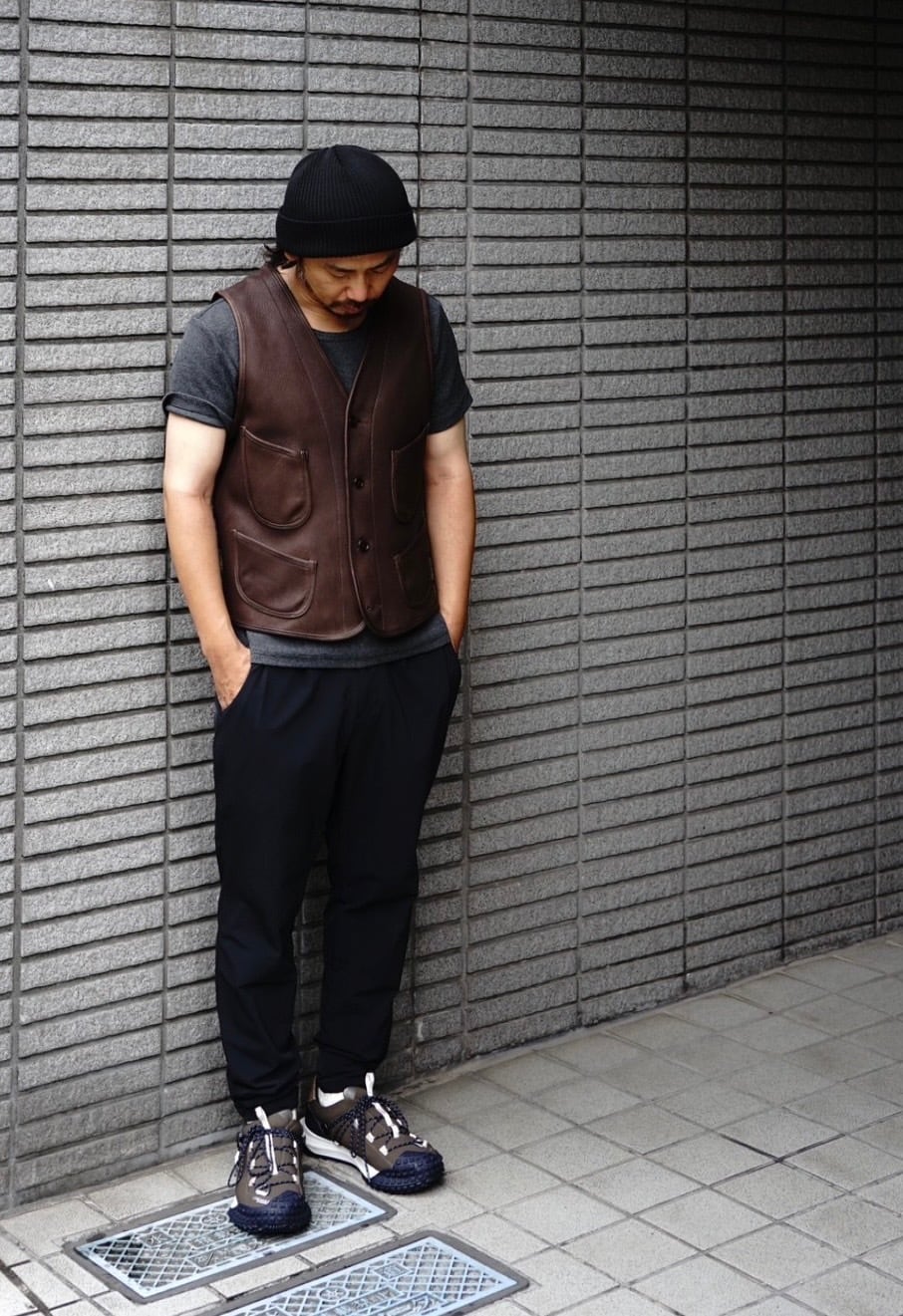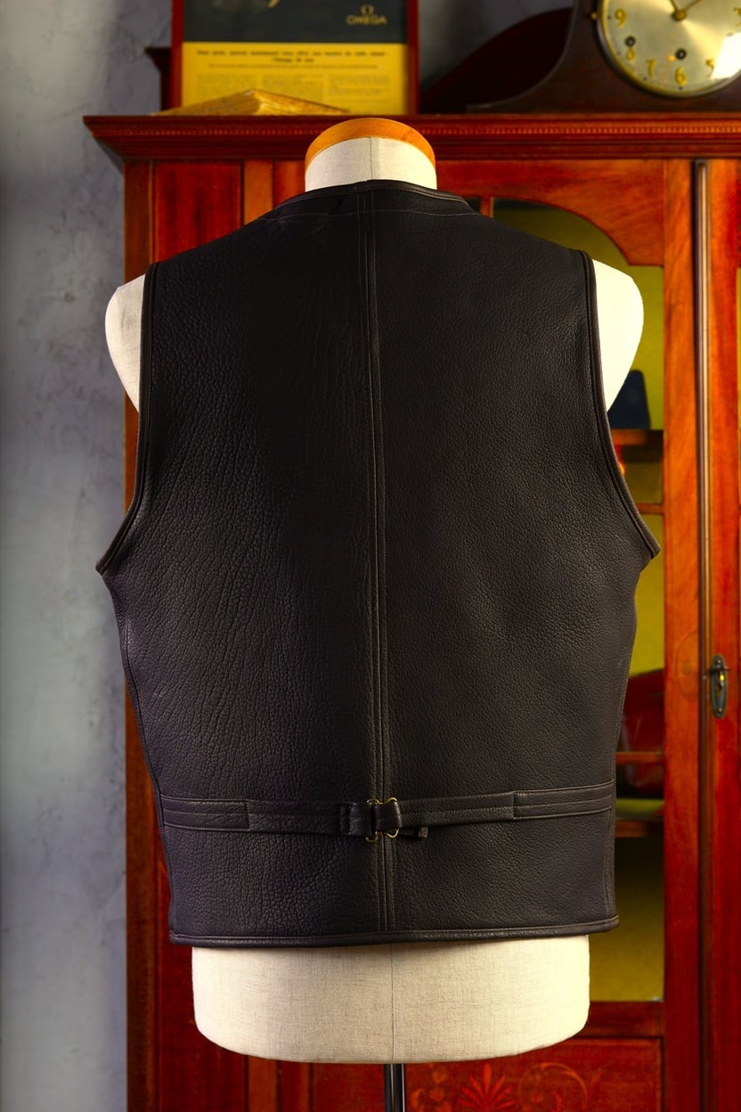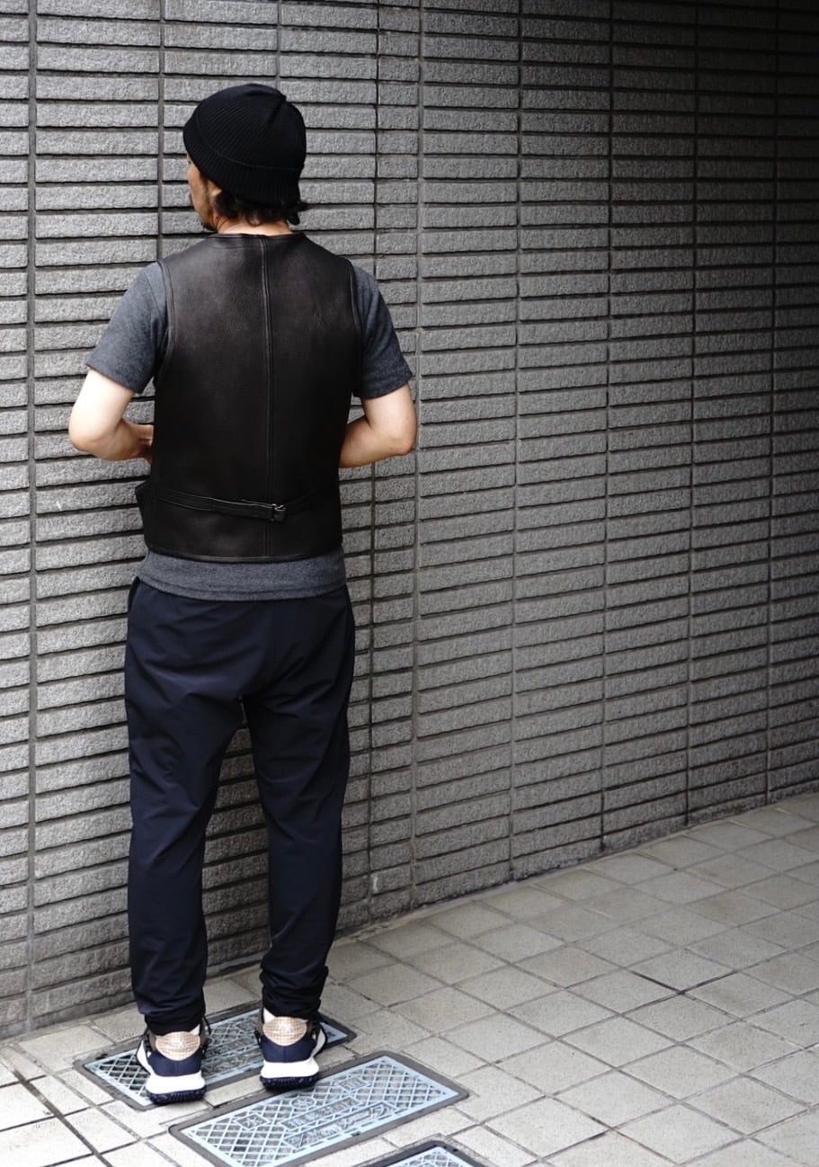 素材にディアスキンレザーを使用した、4ポケットのレザーベスト。