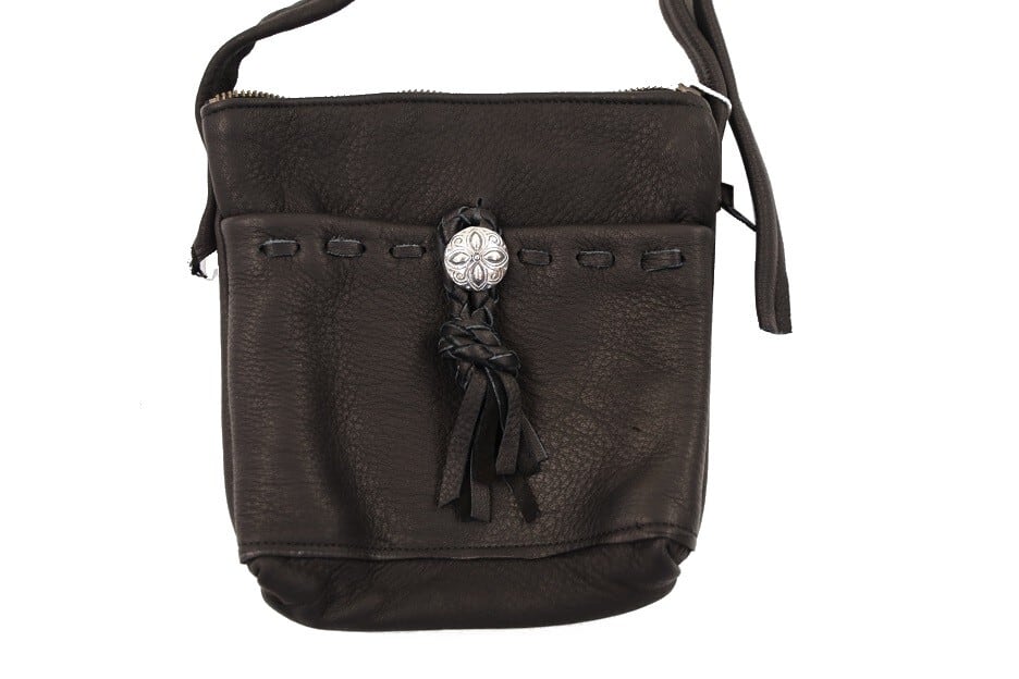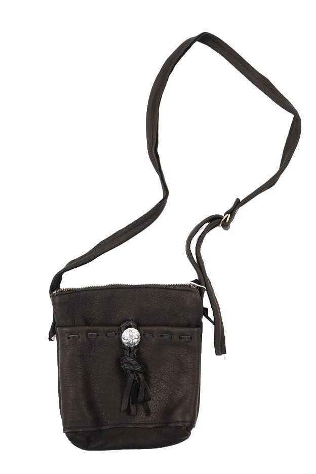 メイン収納には仕切りポケットを設けており、フロントにはコンチョで開閉可能なポケットが付いています。