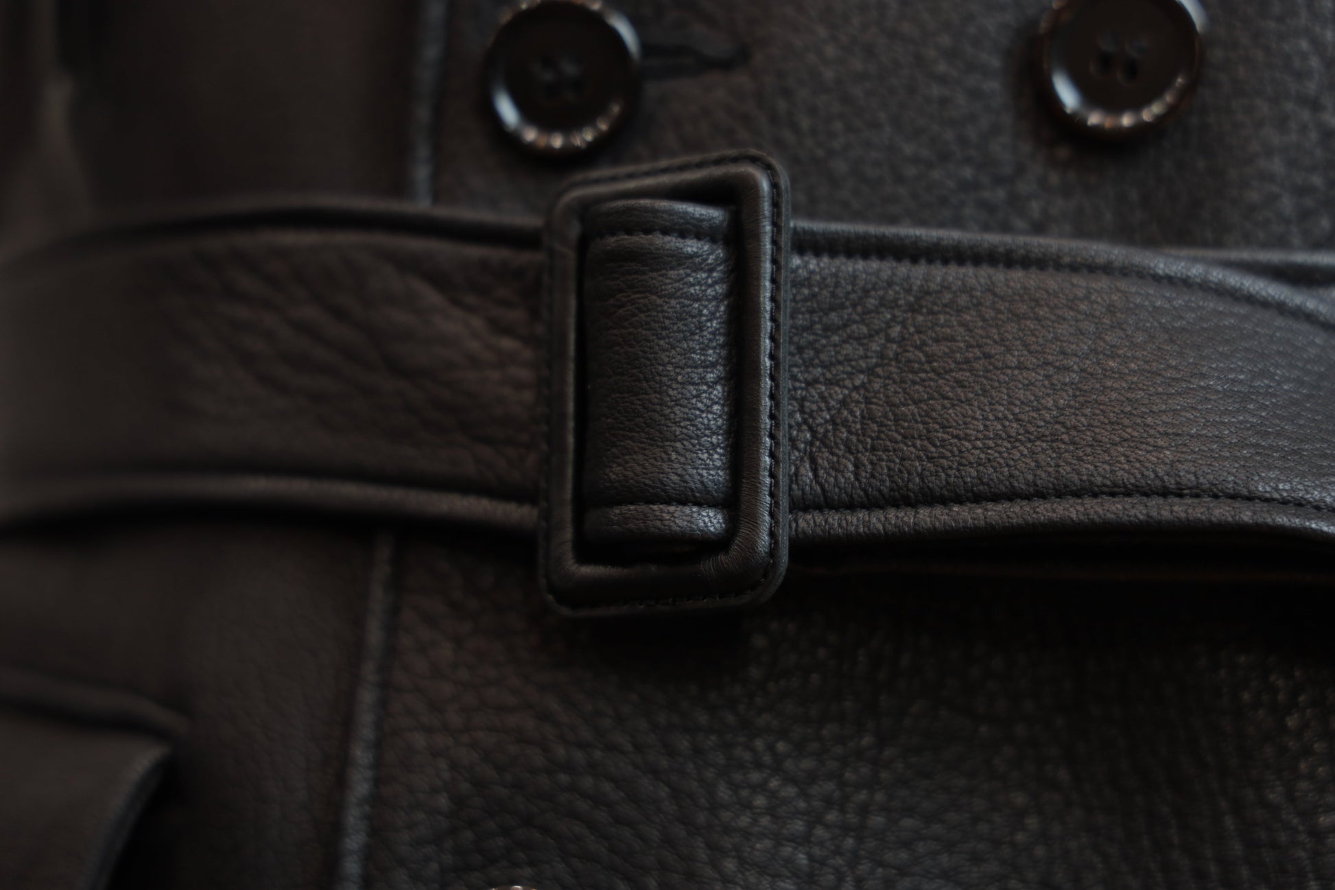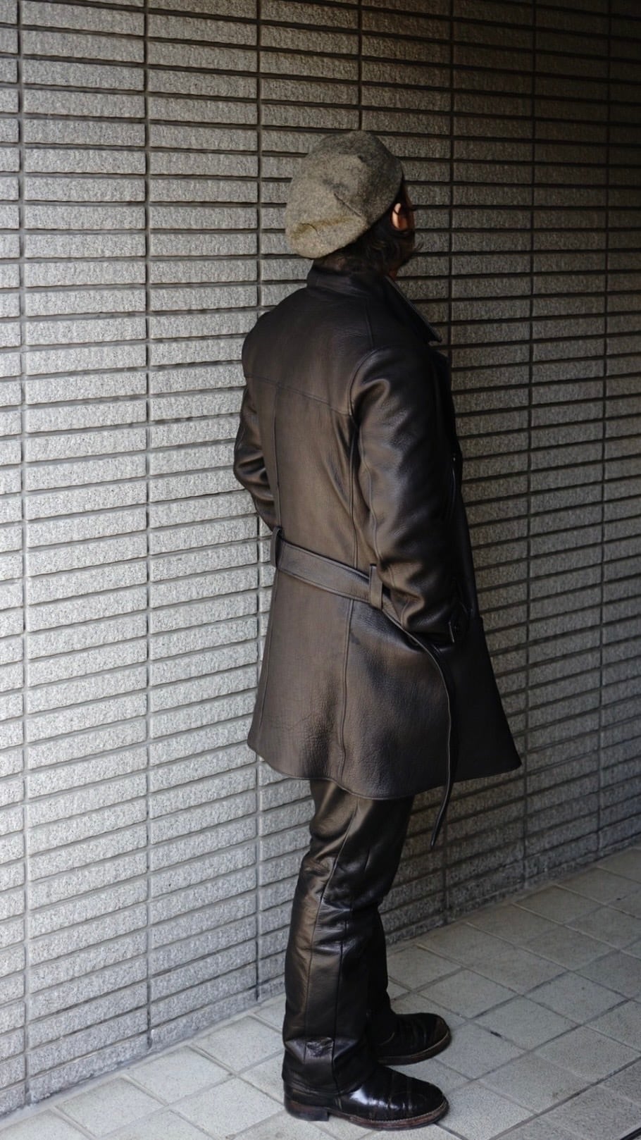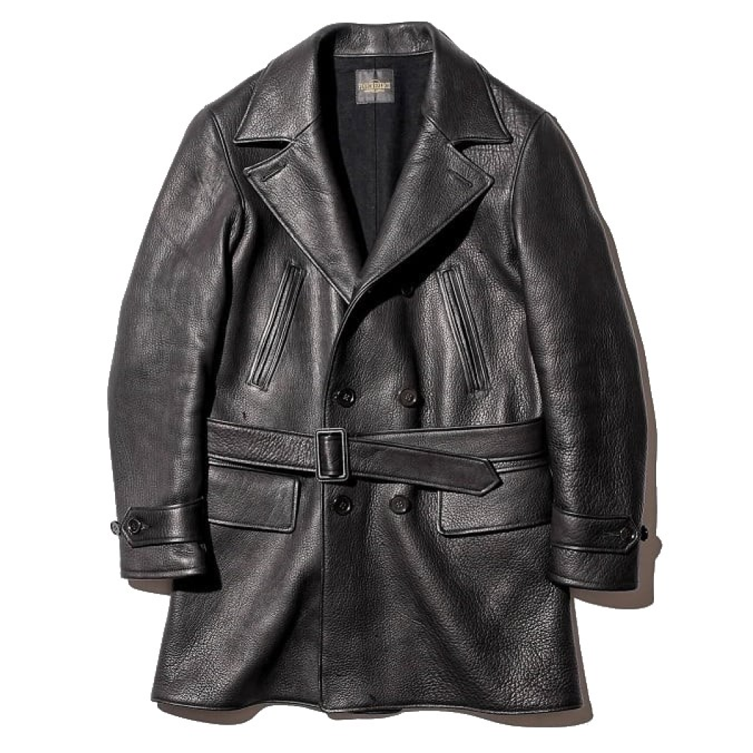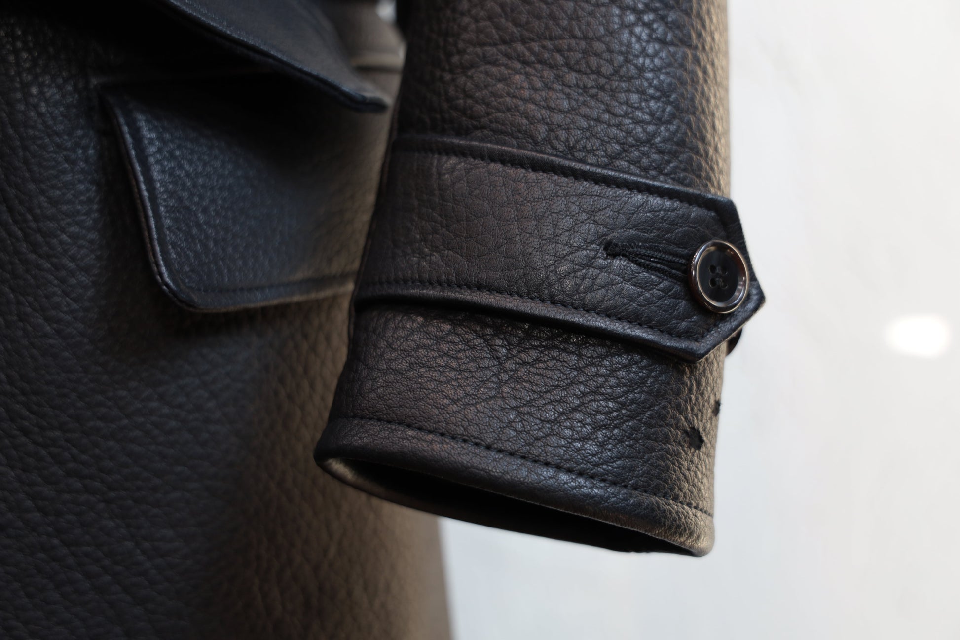 スタイルは30年代を彷彿させるフロント4ポケットのカーコート。胸の位置にくる両玉縁のポケットに、裾は大型のフラップ付ポケットを配備。ウエストは共革のベルトで絞る事が可能となっており、ボタンには水牛角ボタンを使用した、非常に豪華な作りとなっています。