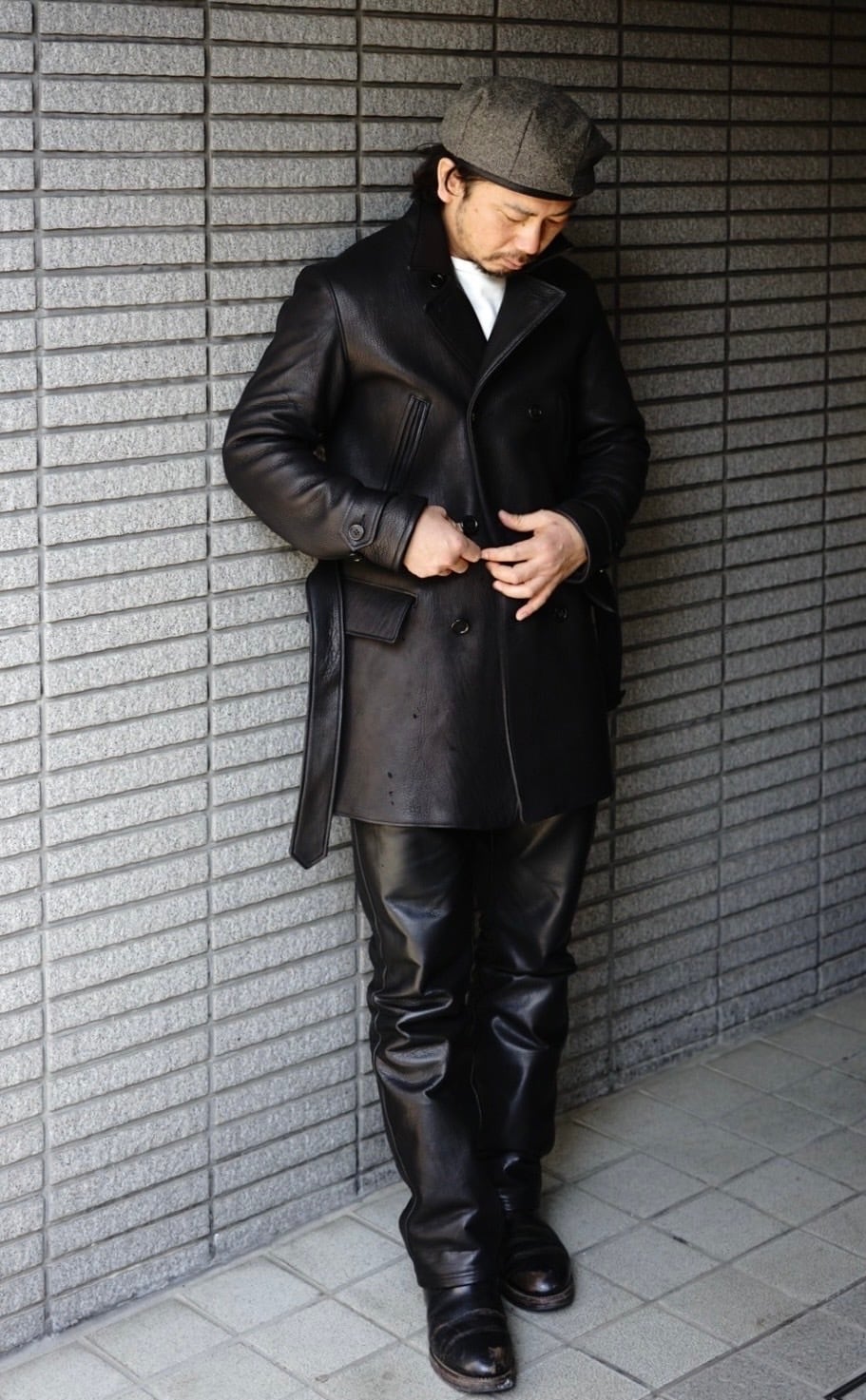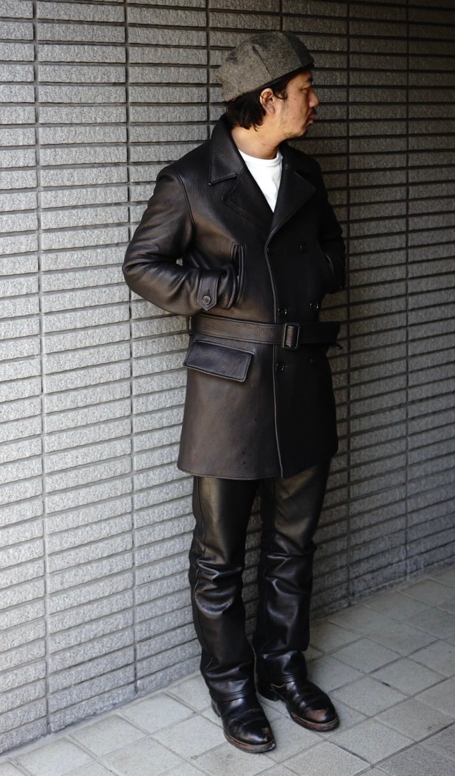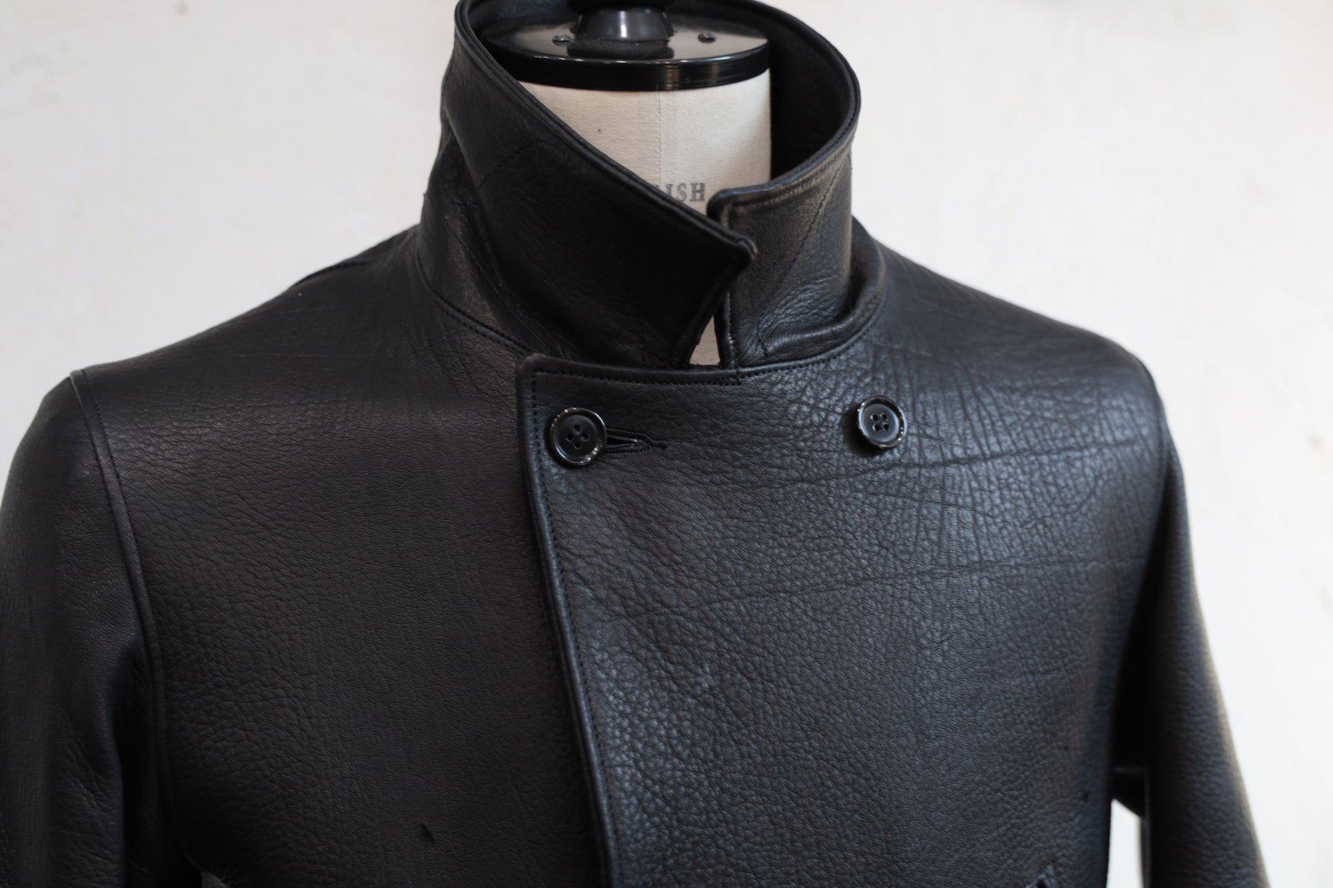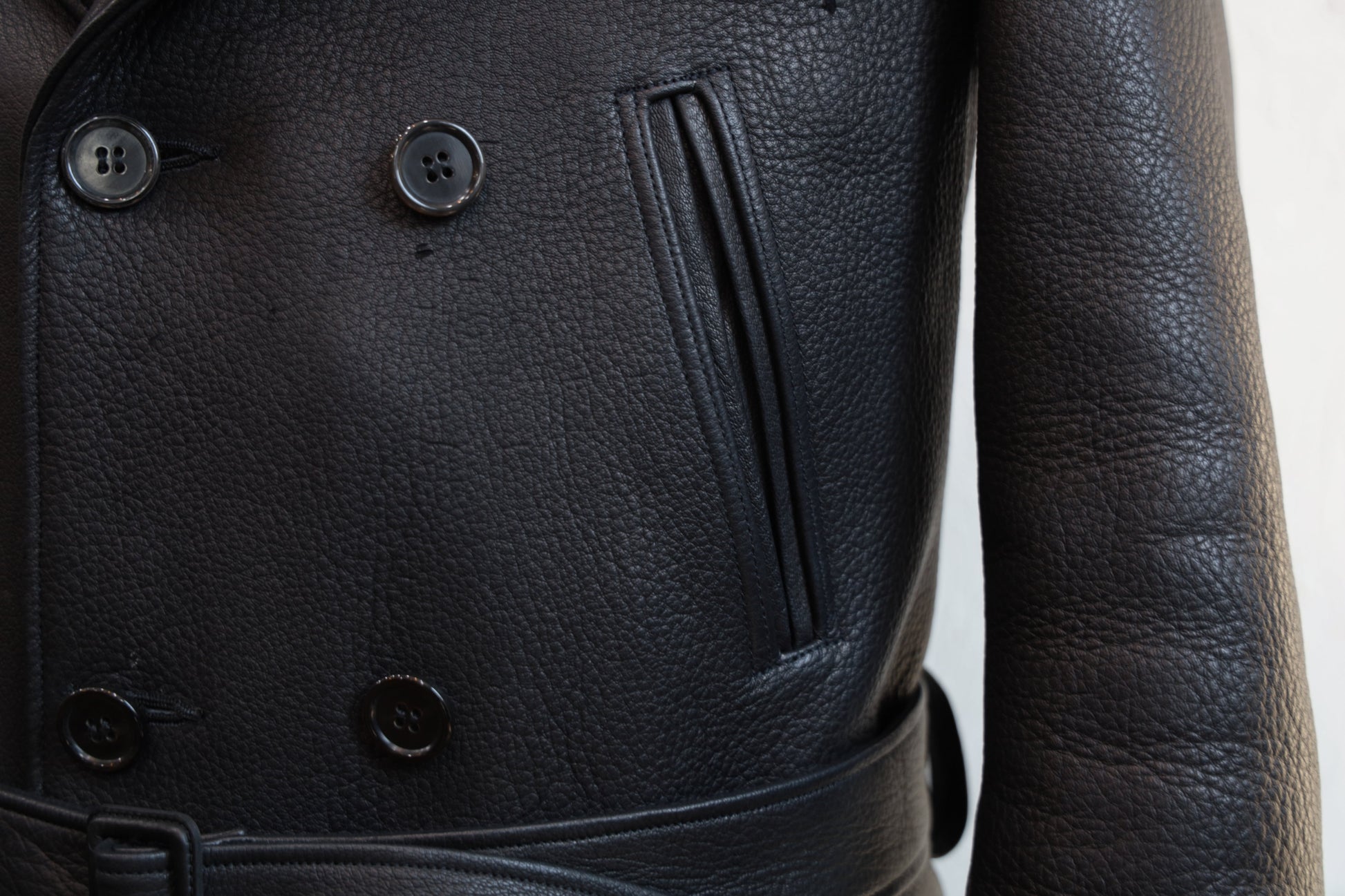 スタイルは30年代を彷彿させるフロント4ポケットのカーコート。胸の位置にくる両玉縁のポケットに、裾は大型のフラップ付ポケットを配備。ウエストは共革のベルトで絞る事が可能となっており、ボタンには水牛角ボタンを使用した、非常に豪華な作りとなっています。