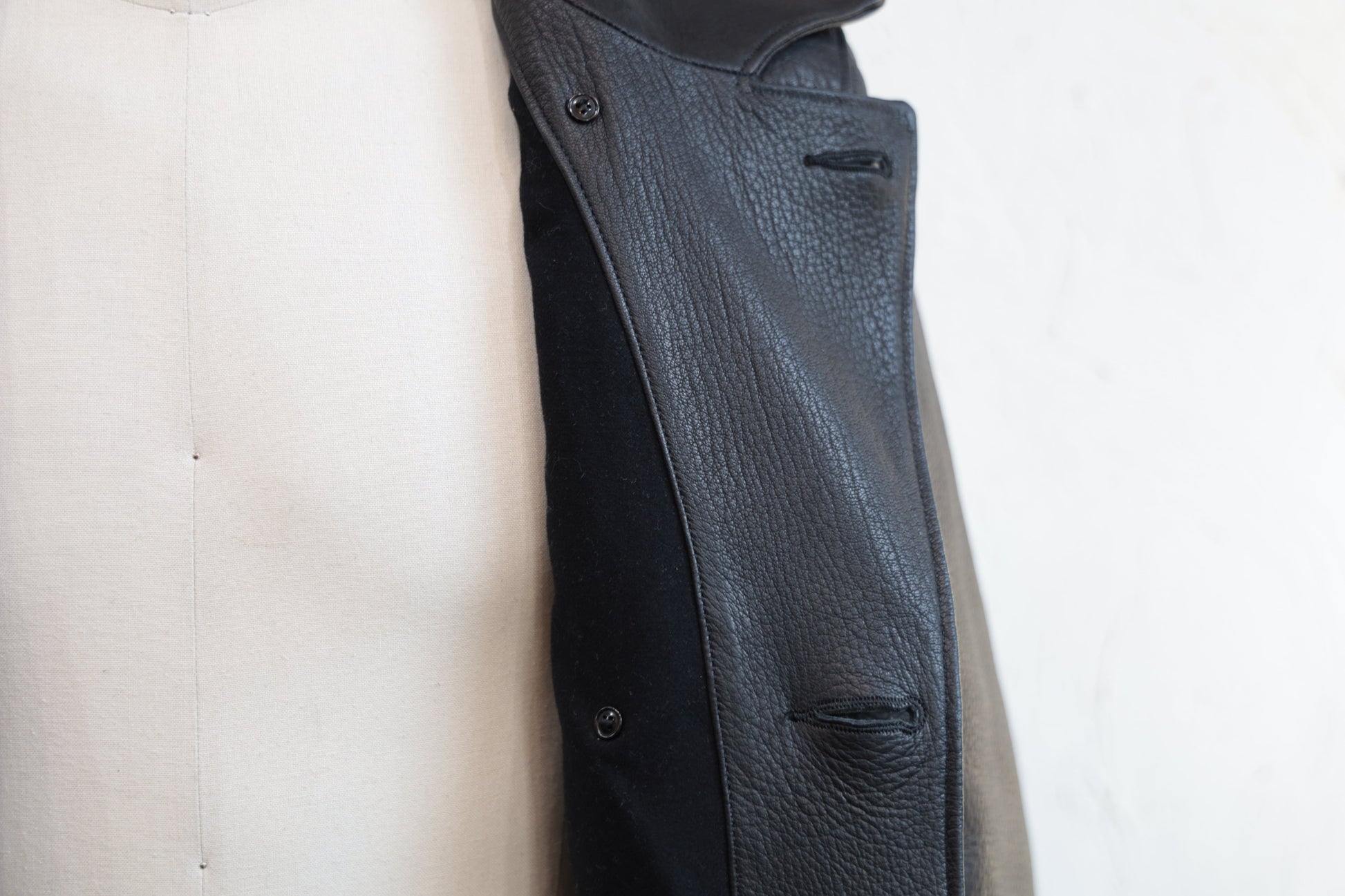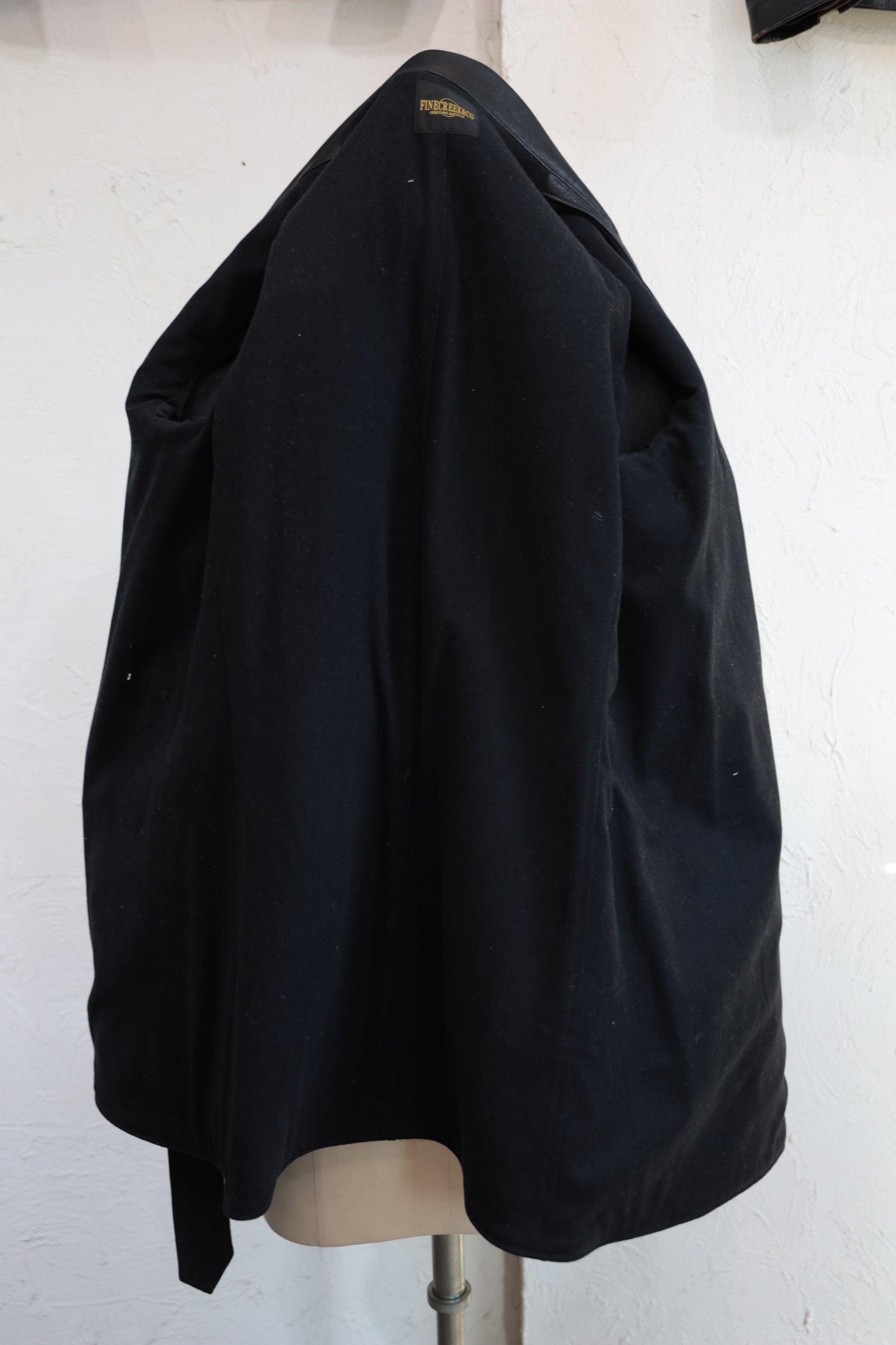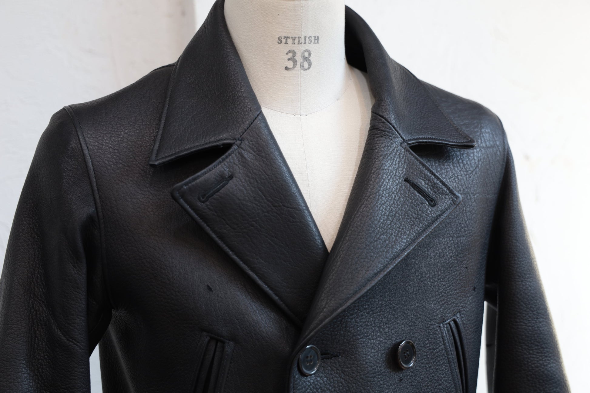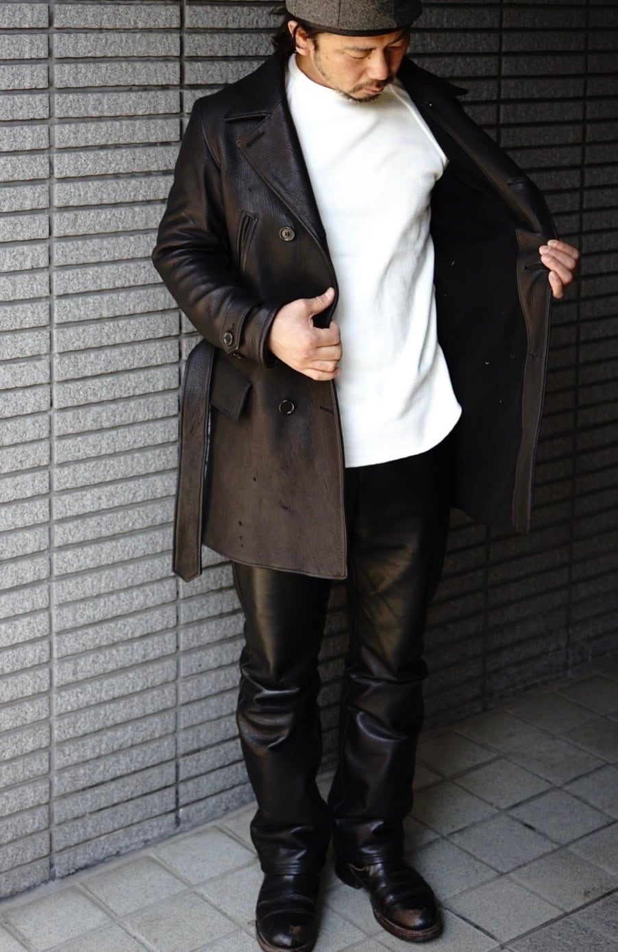 スタイルは30年代を彷彿させるフロント4ポケットのカーコート。胸の位置にくる両玉縁のポケットに、裾は大型のフラップ付ポケットを配備。ウエストは共革のベルトで絞る事が可能となっており、ボタンには水牛角ボタンを使用した、非常に豪華な作りとなっています。